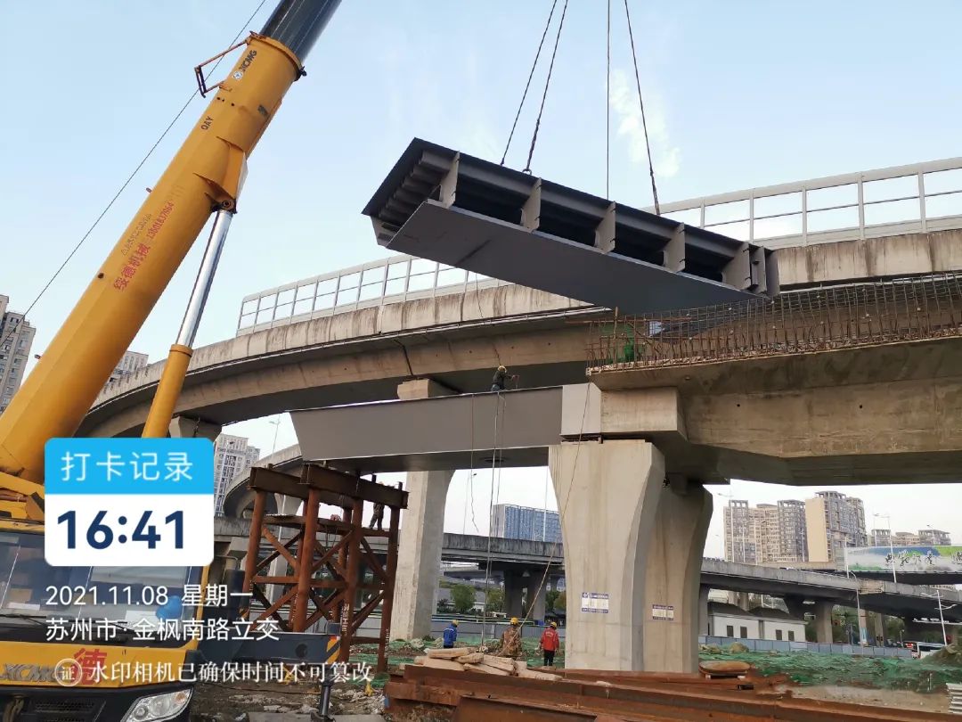 金楓立交西轉南匝道新建工程(WS03-WS05)鋼箱梁,是我公司2021年新簽訂項目之一。目前廠內加工制作還在進行中,部分成品已運送至現場。2021年11月8日,現場開始進行吊裝施工作業。